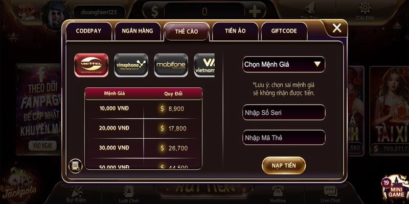 Nạp tiền vào tài khoản cổng game Zowin qua thẻ cào điện thoại